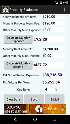 We developed Property Evaluator to run on Android, so you can quickly evaluate a property just by pulling out your Android phone or tablet. Property Evaluator for Android lets Real Estate Investors quickly enter the property information to get a quick analysis so they can make an informed decision on whether the property makes investment sense. We designed it with a built in Mortgage Calculator, and a quick way to enter your Expenses and Income for the property. The result is an easy to read format that gives you the Monthly & Yearly Profit/Loss, Cap Rate, as well as estimated Out of Pocket Expenses that includes estimated Closing Costs. We also created a short cut link to Zillow.com and Bankrate.com so you can research that property then find the best mortgage rate right from your Android phone or tablet.